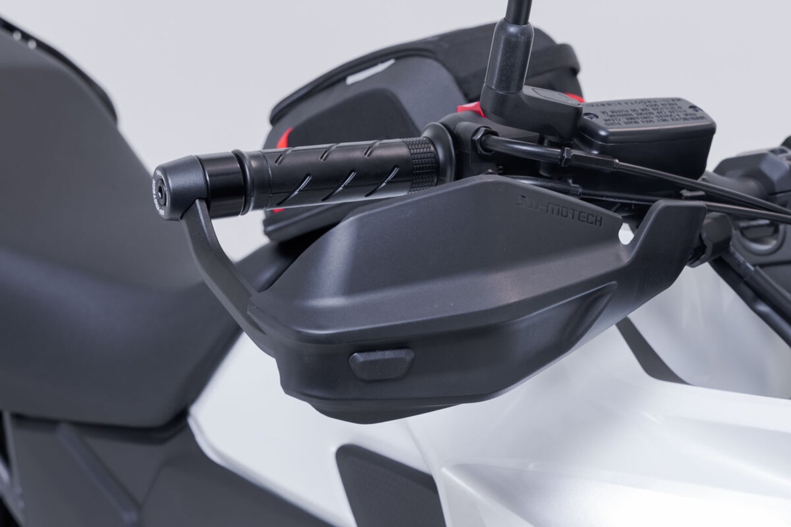 Whether on the road or off-road: The Adventure handguard kit protects the handlebar of your bike in the event of a fall and your hands from the elements as well as stone chips and branches. The basis is a sturdy aluminum bracket to which the Adventure handguard shells are attached. The impact-resistant polypropylene plastic of the shells is flexible and offers the best protection from wind and weather; when driving off-road, your hands are protected from falling stones and contact with branches and bushes. The elegant shells with a matt black surface ensure a distinctive look on your bike. Thanks to the closed shape of the Adventure handguards, the handlebar and hands are also covered on the sides. For even more protection, the separately available crash pad set can be attached to the handguards. The extension set, which increases the protection area of the Adventure handguards, provides more weather protection.