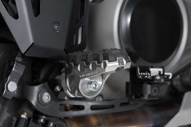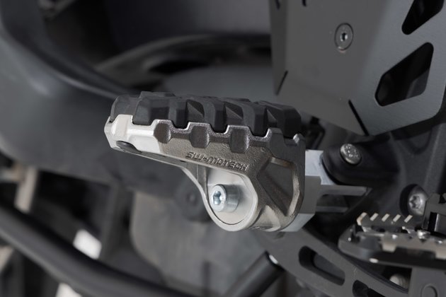 Is your original footrest impossible to position comfortably? Then the EVO footrest kit from SW-MOTECH is the perfect solution for you. This sophisticated system, consisting of rotating elements with firmly interlocking teeth, gives you 36 options for positioning. The position of the footrest can be adjusted so that it's lower or moved forwards or backwards as well as adjusted in terms of its angle to suit your individual needs. The bike-specific joint adapters are simply mounted on to the original parts of the footrest holder. We'll show you how this works in the mounting instructions.