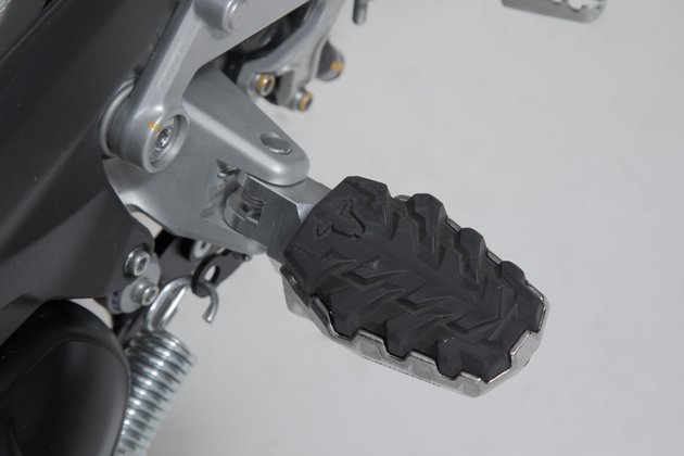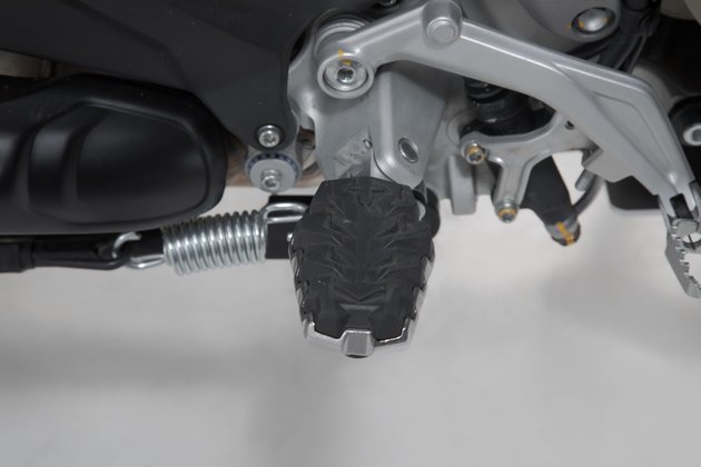 Is your original footrest impossible to position comfortably? Then the EVO footrest kit from SW-MOTECH is the perfect solution for you. This sophisticated system, consisting of rotating elements with firmly interlocking teeth, gives you 36 options for positioning. The position of the footrest can be adjusted so that it's lower or moved forwards or backwards as well as adjusted in terms of its angle to suit your individual needs. The bike-specific joint adapters are simply mounted on to the original parts of the footrest holder. We'll show you how this works in the mounting instructions.