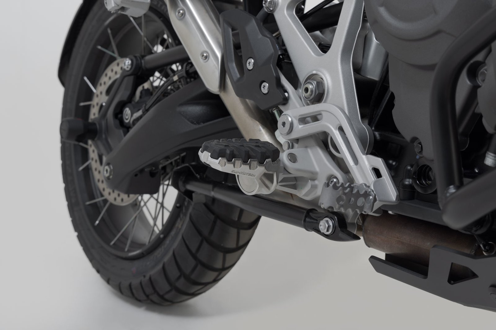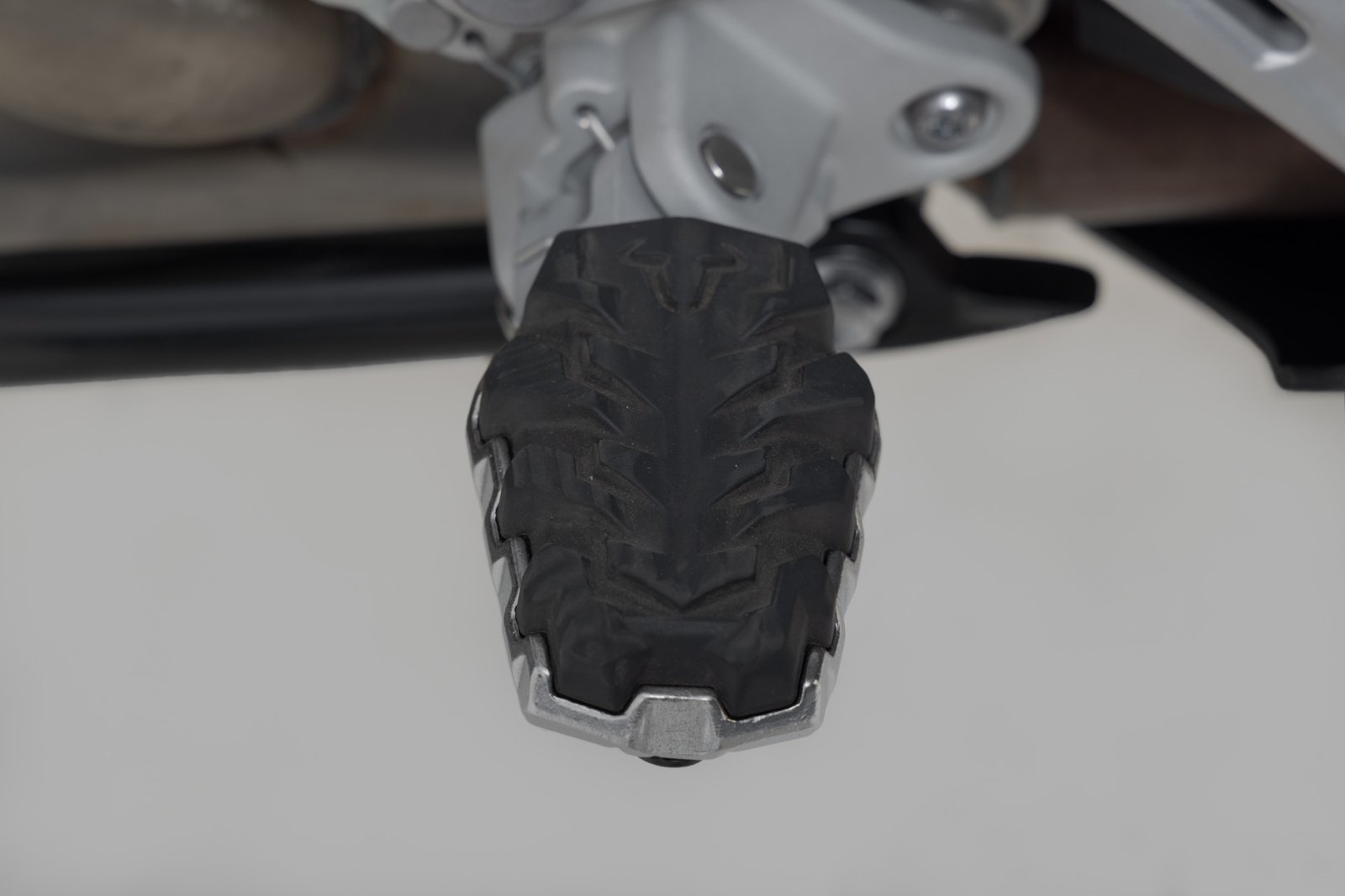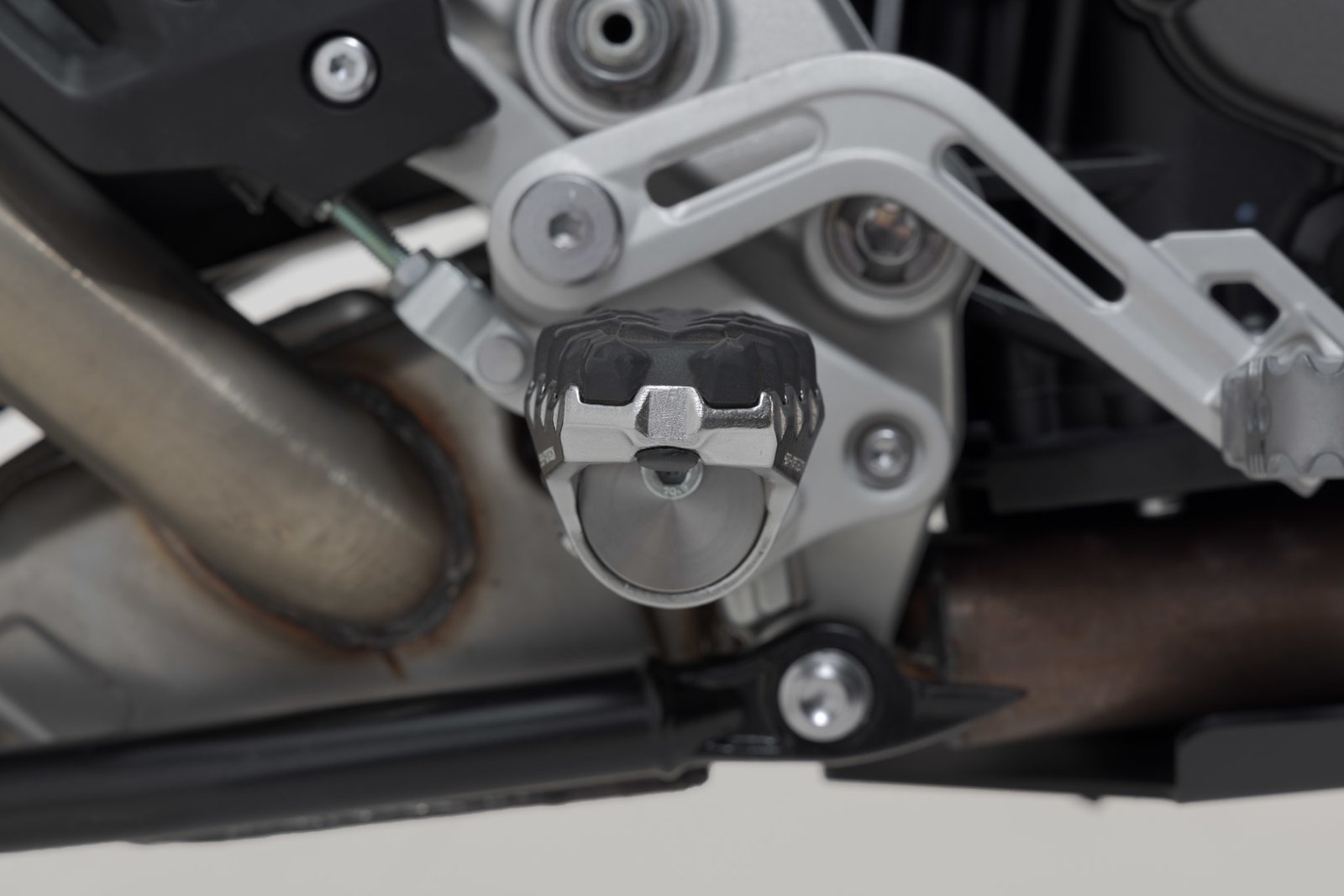 Is your original footrest impossible to position comfortably? Then the EVO footrest kit from SW-MOTECH is the perfect solution for you. This sophisticated system, consisting of rotating elements with firmly interlocking teeth, gives you 36 options for positioning. The position of the footrest can be adjusted so that it's lower or moved forwards or backwards as well as adjusted in terms of its angle to suit your individual needs. The bike-specific joint adapters are simply mounted on to the original parts of the footrest holder. We'll show you how this works in the mounting instructions.