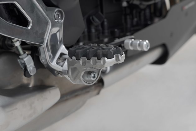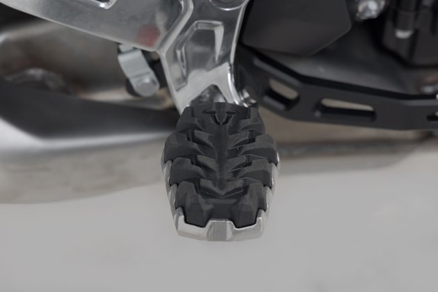 Is your original footrest impossible to position comfortably? Then the EVO footrest kit from SW-MOTECH is the perfect solution for you. This sophisticated system, consisting of rotating elements with firmly interlocking teeth, gives you 36 options for positioning. The position of the footrest can be adjusted so that it's lower or moved forwards or backwards as well as adjusted in terms of its angle to suit your individual needs. The bike-specific joint adapters are simply mounted on to the original parts of the footrest holder. We'll show you how this works in the mounting instructions.
