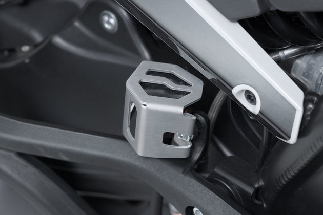 The compact brake reservoir guard protects the original brake reservoir from rock chips and simultaneously prevents unwanted removal of the cover. The protector can be installed on the motorcycle in a few simple steps.