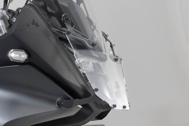 The headlight guard with transparent and extremely strong protective screen made of Makrolon keeps out stone chips and other objects. The support frame is made of laser cut and high strength steel.