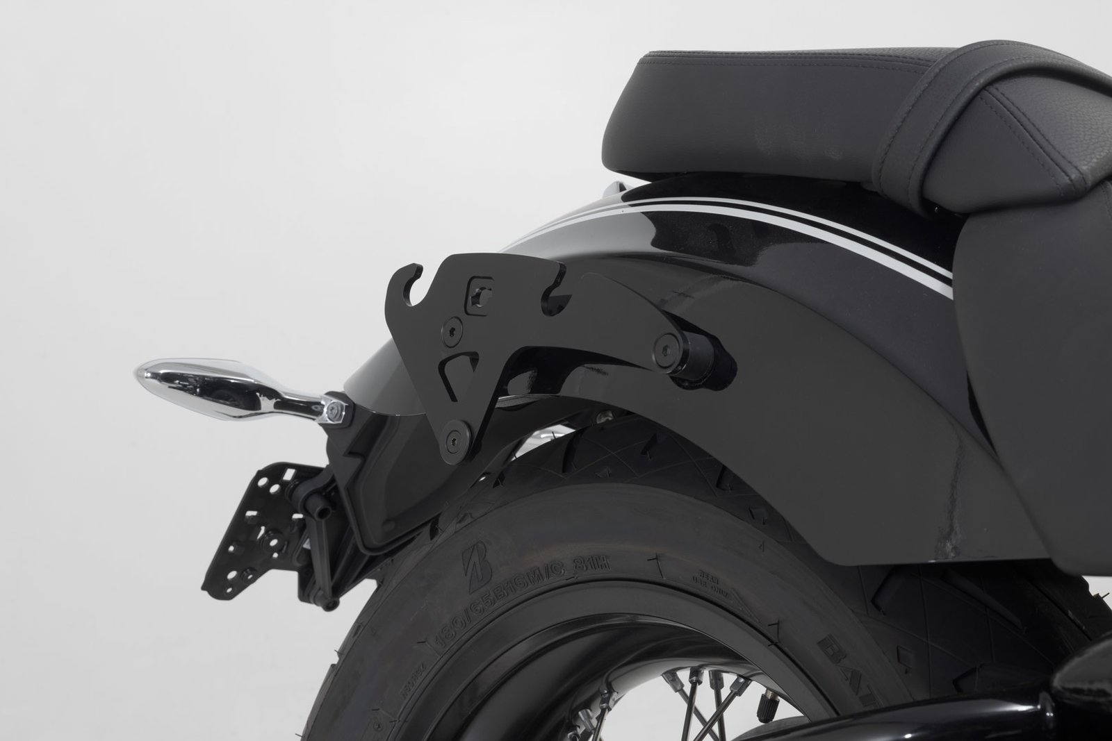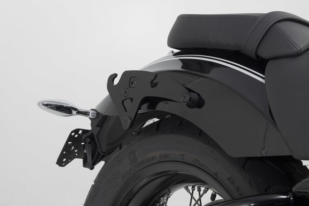 The bike-specific bag carrier can be easily and quickly mounted on to original attachment points on the fender strut. The quick lock system allows LH Legend Gear side bags to be attached and removed in just a few easy hand movements, without the driver foregoing reliable bag fastening.