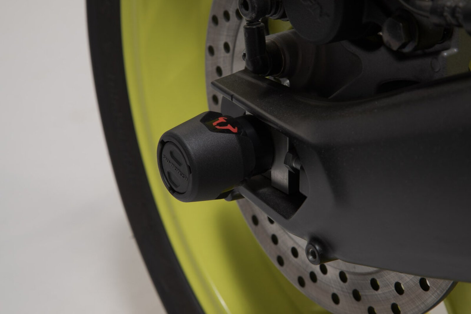 Swingarm sliders made of abrasion proof syntehtics to protect the rear axle.