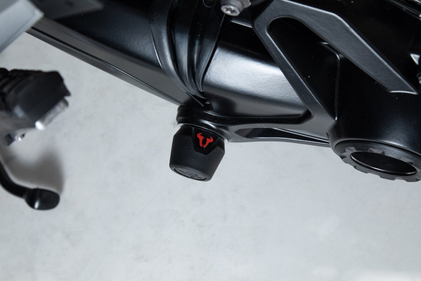Swingarm Sliders made of abrasion proof synthetics to protect the rear axle.