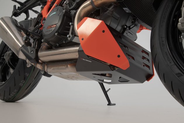 The SW-MOTECH front spoiler, which is tailored to the design of the bike, offers reliable protection against stone chips and unintentional contact with the ground. The powder coating on the surface is extremely durable and permanently protects against corrosion. Extremely sturdy underbody protection can be easily attached to original attachment points using the custom steel attachments provided, all without drilling or welding.