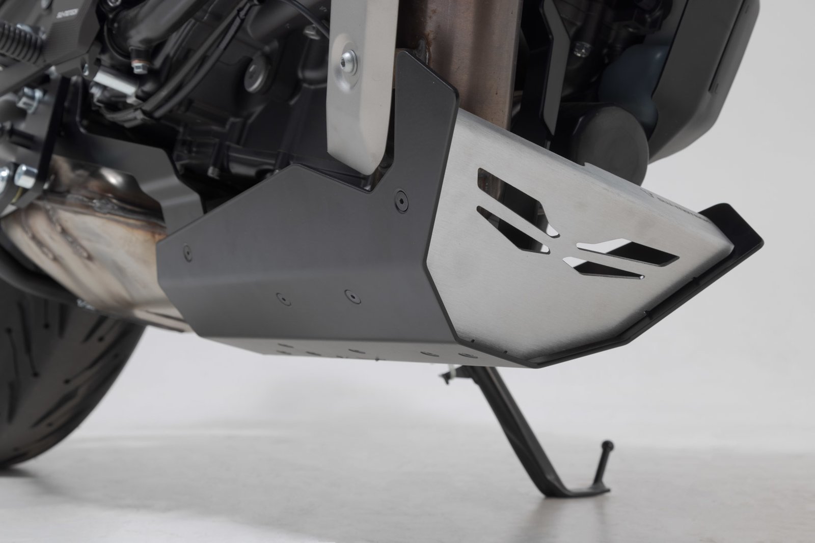 The SW-MOTECH front spoiler, which is tailored to the design of the bike, offers reliable protection against stone chips and unintentional contact with the ground. The powder coating on the surface is extremely durable and permanently protects against corrosion. Extremely sturdy underbody protection can be easily attached to original attachment points using the custom steel attachments provided, all without drilling or welding.