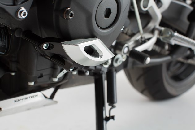 Engine Case Protector for Yamaha XSR900 (16-), XSR900 Abarth (17-), MT-09 (14-) and MT-09 Tracer (14-)Protector for left engine case, machine milled from high-strength aluminum alloy. The elegant construction effectively prevents severe damage to the exposed parts of the engine case in case of ground contact or an accident. The protector consists of a black anodized aluminum frame and a silver anodized aluminum pad.