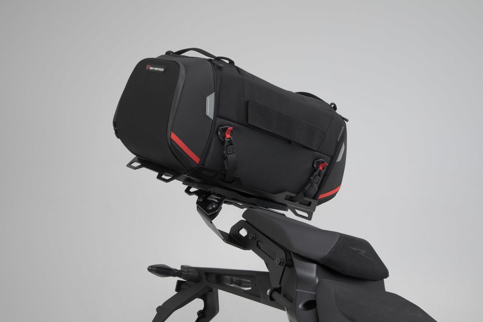 Tail bag ze série PRO je vyroben společností SW-MOTECH z nezničitelného 1680 D Ballistic Nylonu a nosič z robustní hliníkové slitiny. Nosič je připevněn k pružným montážním bodům na motocyklu specifickým pro jízdní kolo.