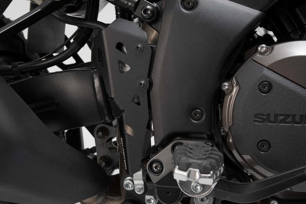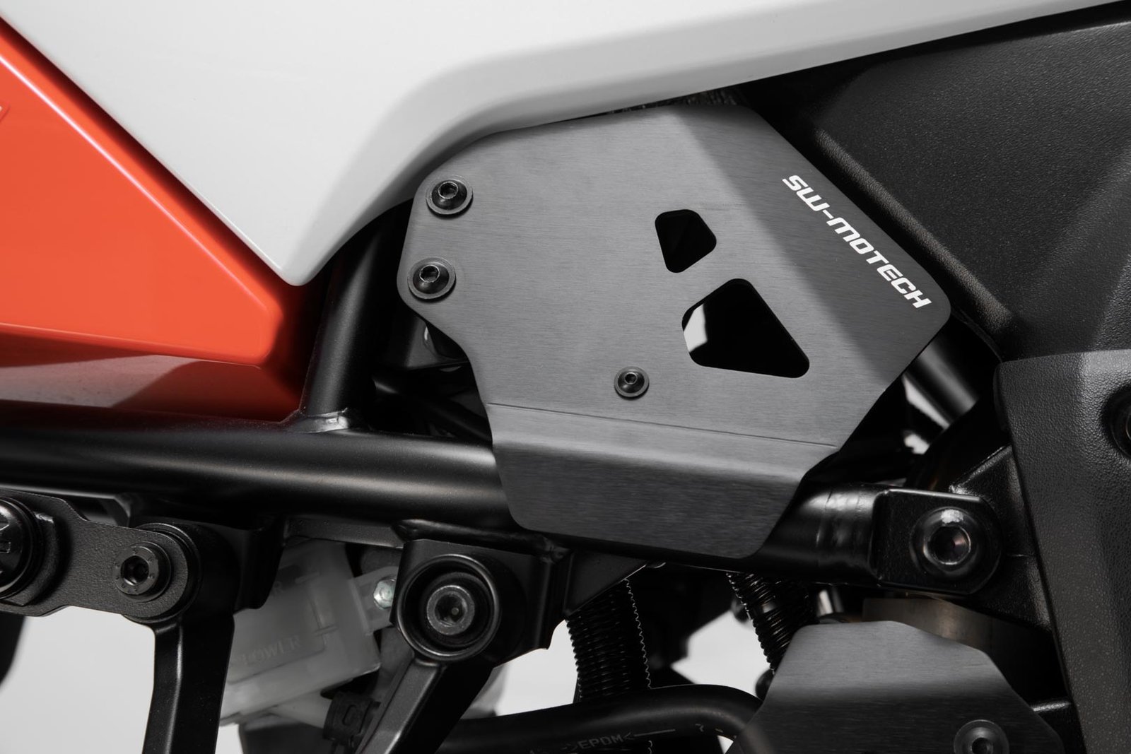 The protection set contains the following components suitable for the Suzuki V-Strom 1050 / 1050 XT: Brake pump protection, Header pipe guard, Chain guard and Right side cover.
