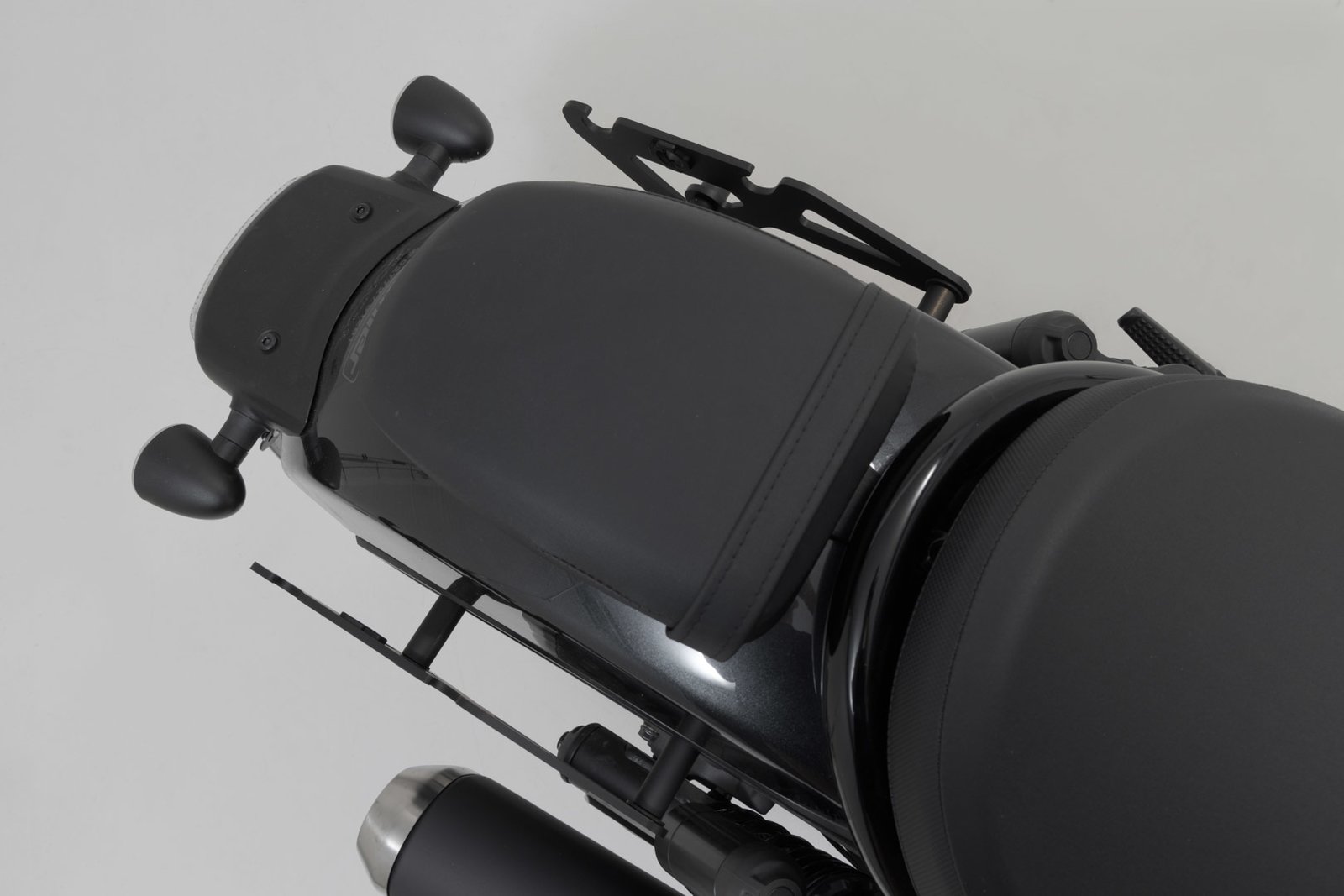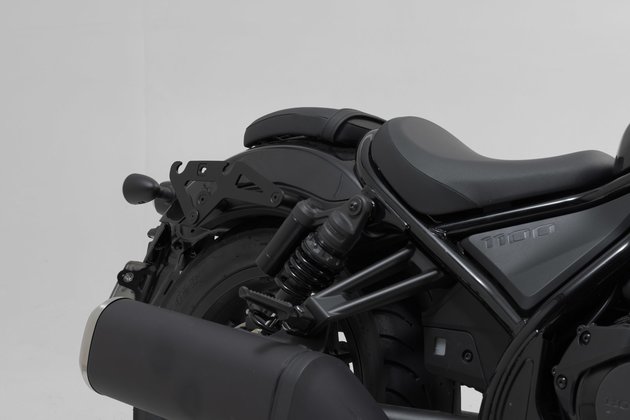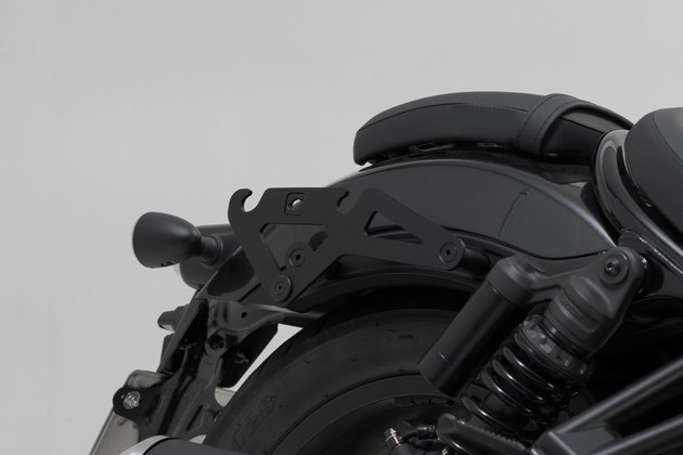 The bike-specific bag carrier can be easily and quickly mounted on to original attachment points on the fender strut. The quick lock system allows LH Legend Gear side bags to be attached and removed in just a few easy hand movements, without the driver foregoing reliable bag fastening.