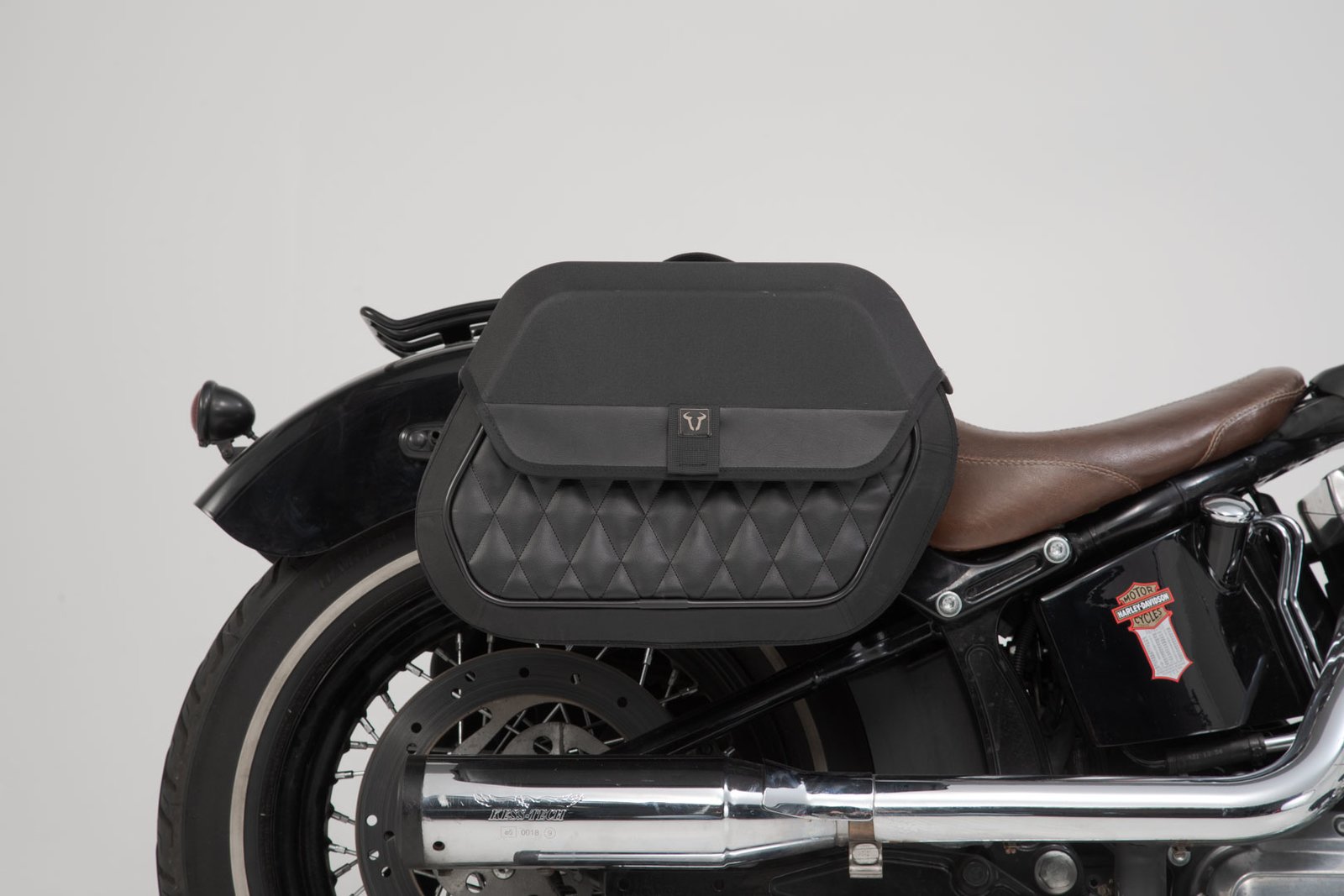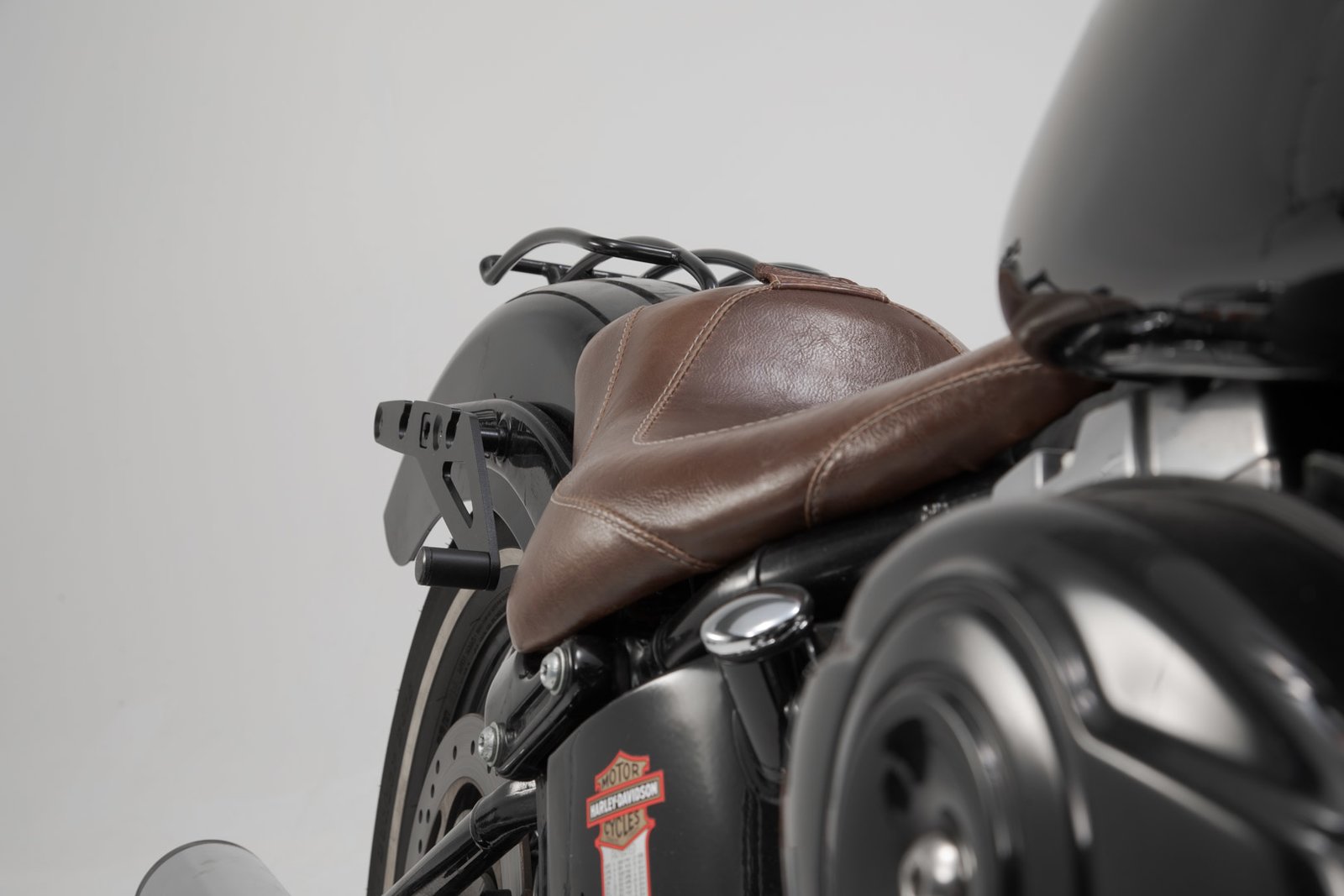 The bike-specific bag carrier can be easily and quickly mounted on to original attachment points on the fender strut. The quick lock system allows LH Legend Gear side bags to be attached and removed in just a few easy hand movements, without the driver foregoing reliable bag fastening. It can also be used in combination with original Harley-Davidson accessories such as the sissy bar or rack.