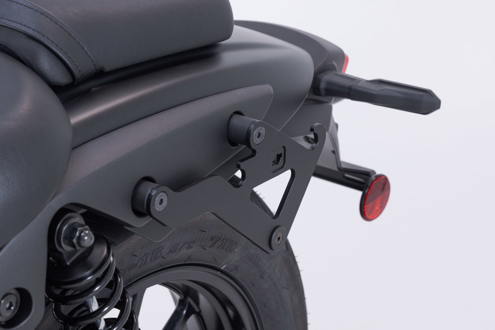 The bike-specific bag carrier can be easily and quickly mounted on to original attachment points on the fender strut. The quick lock system allows LH Legend Gear side bags to be attached and removed in just a few easy hand movements, without the driver foregoing reliable bag fastening.