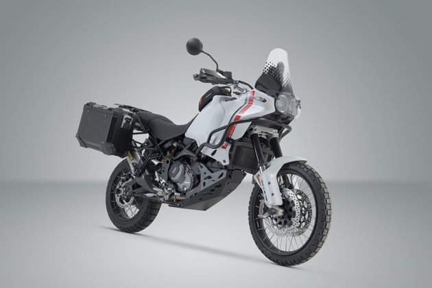 SW-MOTECH postavil černý hliníkový systém kufrů vhodný pro Ducati DesertX pomocí extrémně odolných bočních nosičů PRO specifických pro kolo.