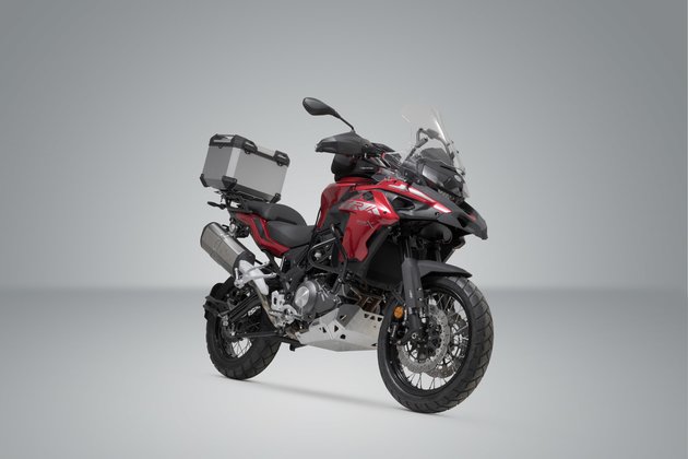 The TRAX ADV top case system consists of a rugged silver anodized top case and the matching ADVENTURE-RACK for the Benelli TRK 502 X.