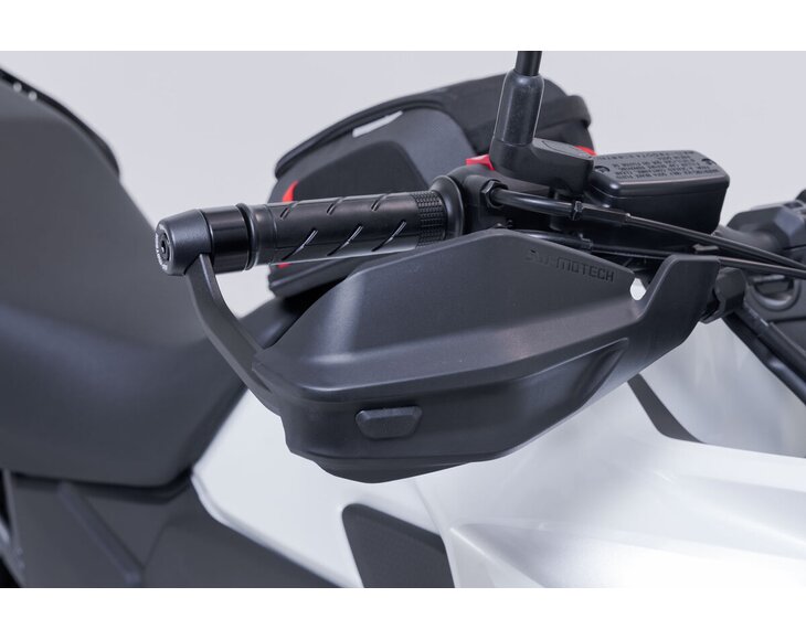 Whether on the road or off-road: The Adventure handguard kit protects the handlebar of your bike in the event of a fall and your hands from the elements as well as stone chips and branches. The basis is a sturdy aluminum bracket to which the Adventure handguard shells are attached. The impact-resistant polypropylene plastic of the shells is flexible and offers the best protection from wind and weather; when driving off-road, your hands are protected from falling stones and contact with branches and bushes. The elegant shells with a matt black surface ensure a distinctive look on your bike. Thanks to the closed shape of the Adventure handguards, the handlebar and hands are also covered on the sides. For even more protection, the separately available crash pad set can be attached to the handguards. The extension set, which increases the protection area of the Adventure handguards, provides more weather protection.