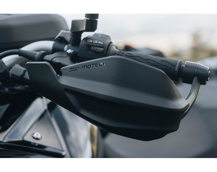 - Adventure handguards made of impact-resistant plastic protect against weather, falling rocks, and branches