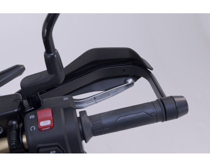 Whether on the road or off-road: The Adventure handguard kit protects the handlebar of your bike in the event of a fall and your hands from the elements as well as stone chips and branches. The basis is a sturdy aluminum bracket to which the Adventure handguard shells are attached. The impact-resistant polypropylene plastic of the shells is flexible and offers the best protection from wind and weather; when driving off-road, your hands are protected from falling stones and contact with branches and bushes. The elegant shells with a matt black surface ensure a distinctive look on your bike. Thanks to the closed shape of the Adventure handguard shells, the handlebar and hands are also covered on the sides. For even more protection, the separately available crash pad set can be attached to the handguards. The extension set, which increases the protection area of the Adventure handguard shells, provides more weather protection.