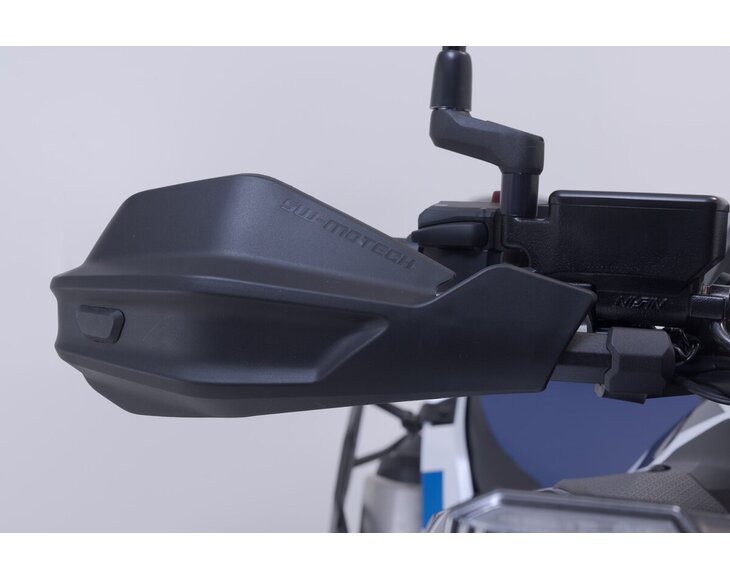 Whether on the road or off-road: The Adventure handguard kit protects the handlebars of your bike in the event of a fall and your hands from the elements as well as stone chips and branches. The basis is a sturdy aluminum bracket to which the Adventure handguard shells are attached. The impact-resistant polypropylene plastic of the shells is flexible and offers the best protection from wind and weather; when driving off-road, your hands are protected from falling stones and contact with branches and bushes. The elegant shells with a matt black surface ensure a distinctive look on your bike. Thanks to the closed shape of the Adventure handguard shells, the handlebar and hands are also covered on the sides. For even more protection, the separately available crash pad set can be attached to the handguards. The extension set, which increases the protection area of the Adventure handguard shells, provides more weather protection.