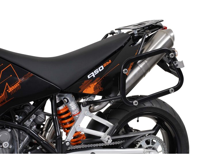 The side carriers are extremely durable and designed to fit closely along the vehicle. SW-MOTECH manufactures these side carriers in robust steel and then finish them off with a black powder coating. The patented QUICK-LOCK system allows the carrier to be attached and removed quickly - after a quarter turn at the attachment points, the carrier can be removed completely and only inconspicuous mounting tabs remain on the motorcycle.