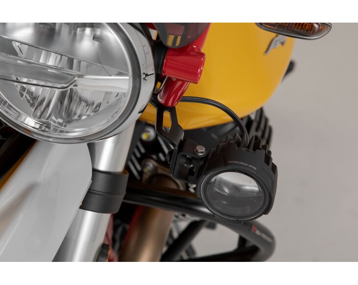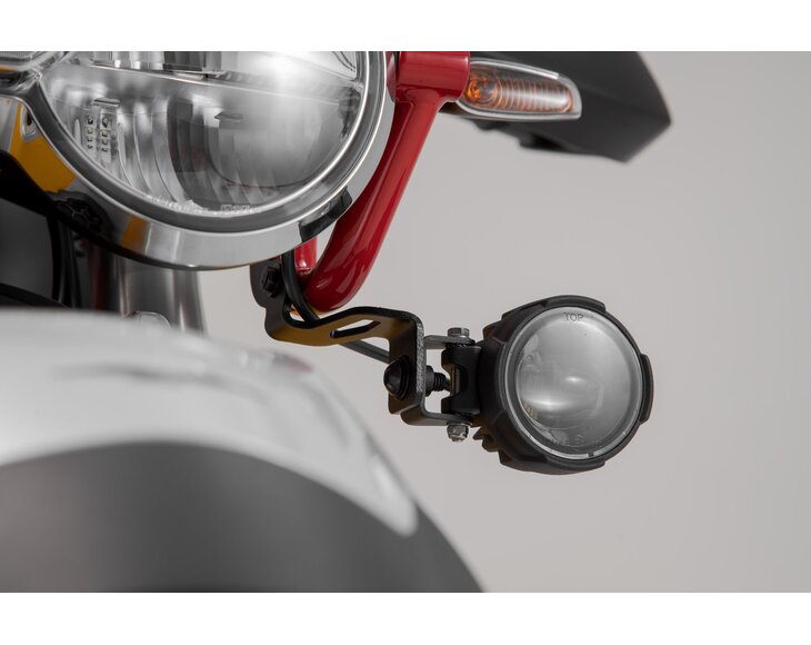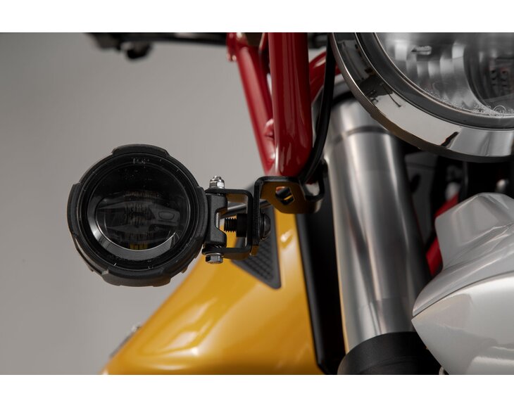 These bike-specific mounts provide optimal positioning of the EVO lights, because they are developed exclusively for each motorcycle model. The sturdy elements made of powder-coated steel are screwed on to existing attachment points. They guarantee secure hold for the EVO lights, even when riding off-road. Please refer to the mounting instructions to determine if headlamps can be mounted standing, hanging and/or sideways on your motorcycle model.