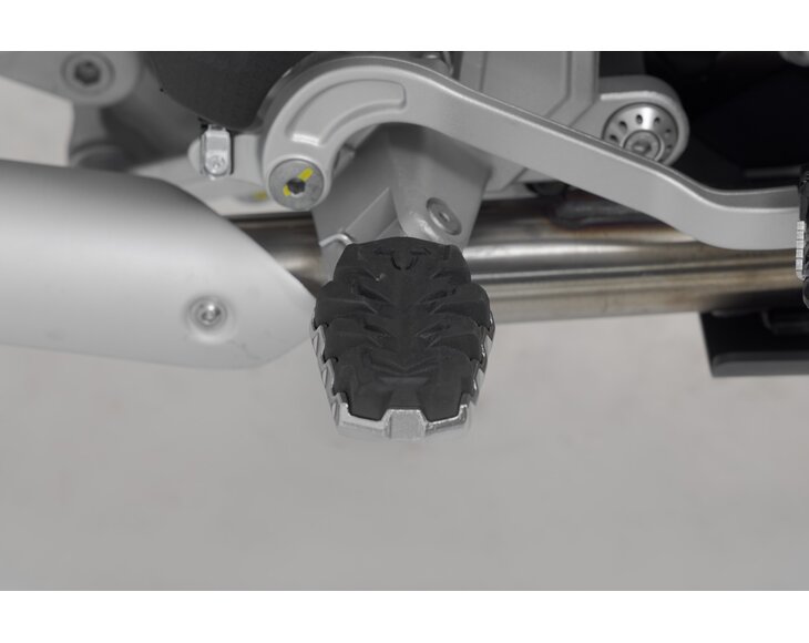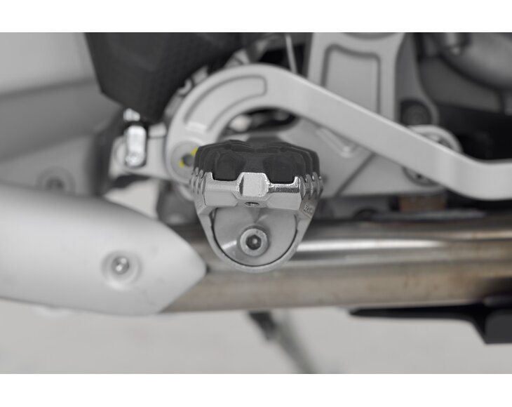 Is your original footrest impossible to position comfortably? Then the EVO footrest kit from SW-MOTECH is the perfect solution for you. This sophisticated system, consisting of rotating elements with firmly interlocking teeth, gives you 36 options for positioning. The position of the footrest can be adjusted so that it's lower or moved forwards or backwards as well as adjusted in terms of its angle to suit your individual needs. The bike-specific joint adapters are simply mounted on to the original parts of the footrest holder. We'll show you how this works in the mounting instructions.