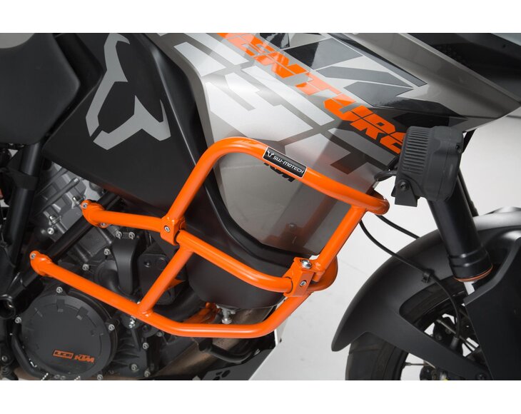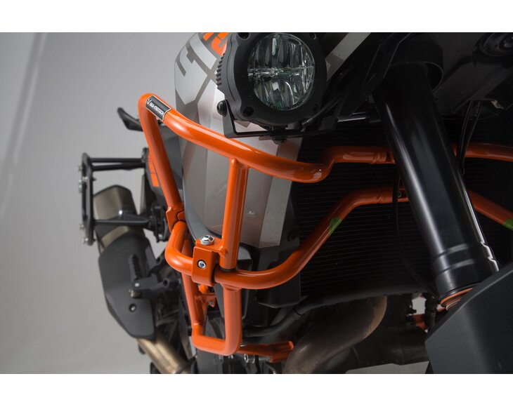 This rugged upper crash bar protects tank and fairing of the KTM 1050 (14-), 1190 Adventure (13-) and 1190 Adventure R (13-) from scratches and damage in case of an accident, helping to avoid costly repairs. The tough steel construction can easily be mounted to the motorcycles original crash bar. Impact resilient CNC machine milled fastenings, integrated into the steel tubing geometry, provide a safe fit. Rubber inserts reduce vehicle vibrations. The upper crash bar is available in black or orange color, matching the tone of the original crash bar. High grade powder coating provides protection against corrosion.