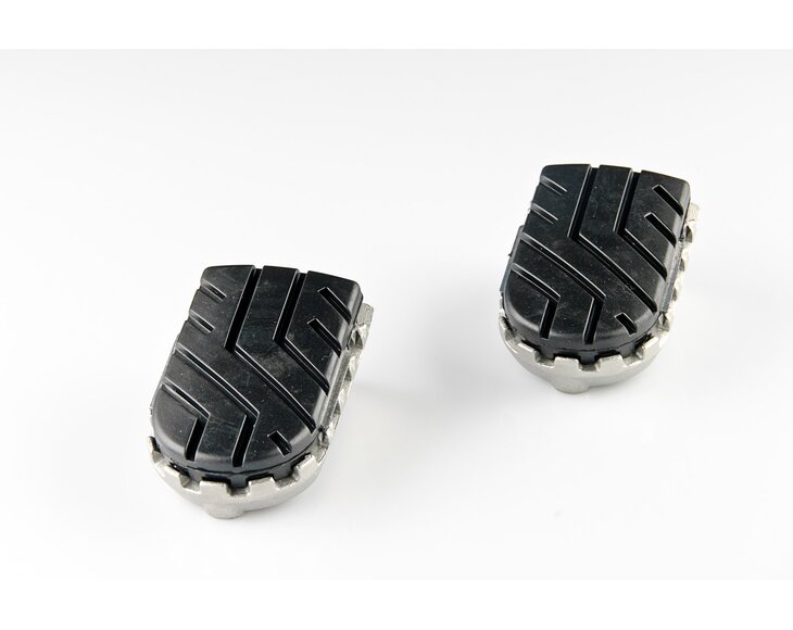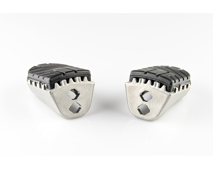 Our reasonably priced ION footrest kits allow the footrest to be mounted at its original height or lowered by 15 mm. Extremely durable and built to last, these stainless-steel footrests provide plenty of extra grip and are recommended for adventure, offroad and urban motorcycles. Hinges made from high-strength aluminum alloy ensure that the footrest can fold out of the way if the bike tips over. The removable rubber top surface reduces vibration, and the profile gives you a firm grip during offroad riding. To mount the bike-specific hinge adapter to the footrest sockets, the original attachments (springs, bolts, etc.) are used.