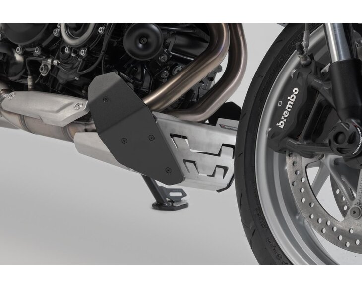 The SW-MOTECH front spoiler, which is tailored to the design of the bike, offers reliable protection against stone chips and unintentional contact with the ground. The powder coating on the surface is extremely durable and permanently protects against corrosion. Extremely sturdy underbody protection can be easily attached to original attachment points using the custom steel attachments provided, all without drilling or welding.