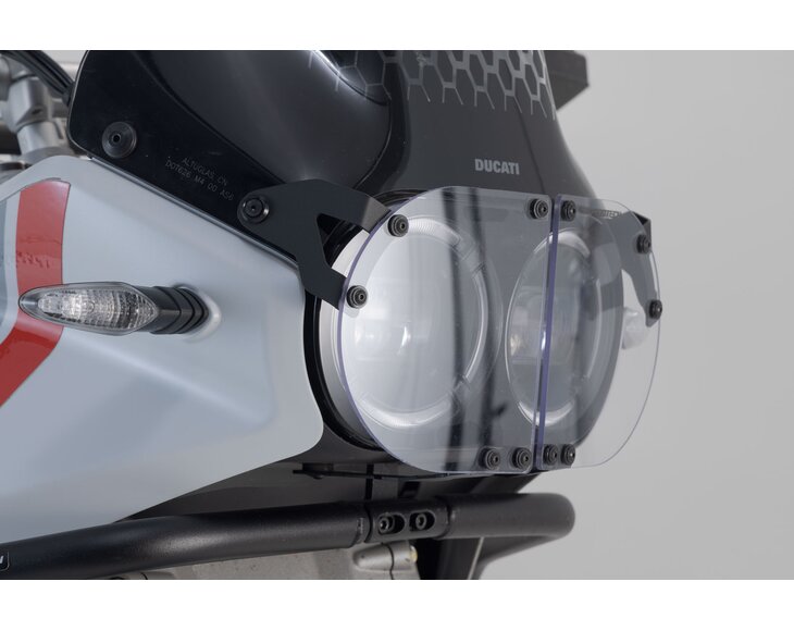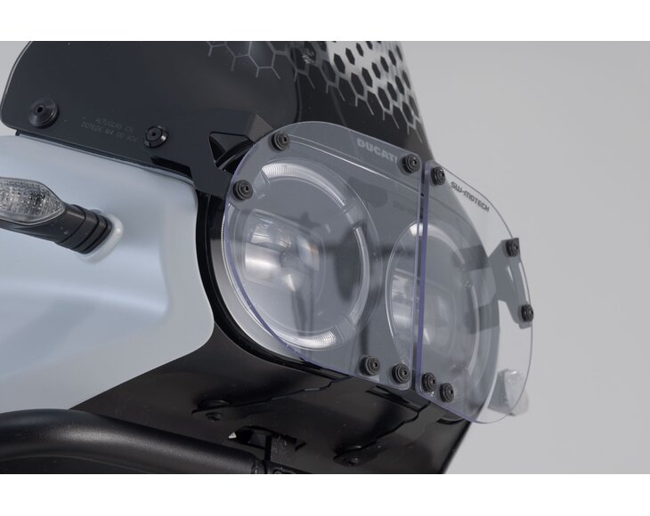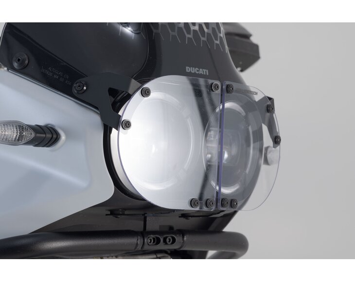 The headlight guard with transparent and extremely strong protective screen made of Makrolon keeps out stone chips and other objects. The support frame is made of laser cut and high strength steel.