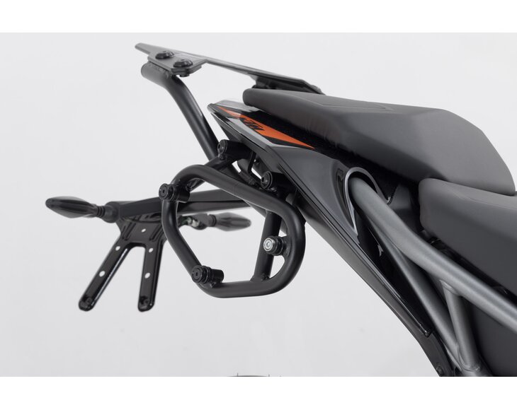 The side bag system consists of the matching SLC side carriers for the KTM 125 Duke as well as an LC1 and an LC2 Legend Gear side bag