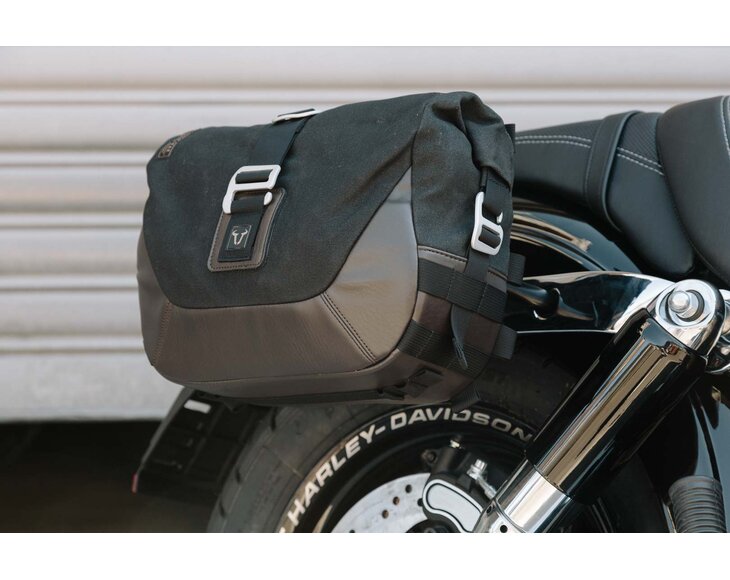 Plays well with steel: Legend Gear LC1 side bags are equipped with a convenient quick lock system for SLC steel side carrier. A combination of coated canvas sailing material/fabric with robust napalon synthetic leather supports the vintage design oft the soft luggage line. The bike-specific SLC side carrier allows easy and sage mounting on original mounting points to the bike. SLC side carrier, made for Harley-Davidson Dyna Fat Bob FXDF, adapts perfectly to the design of the bike. Set includes two Legend Gear LC1 side bags, SLC side carrier and mounting material.