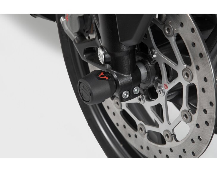 The front axle crash pads made of abrasion-resistant plastic protect the drive shaft from damage in the event of a fall. The smooth surface also provides excellent sliding properties. The polished bull logo in red adds a visual highlight to your motorcycle.