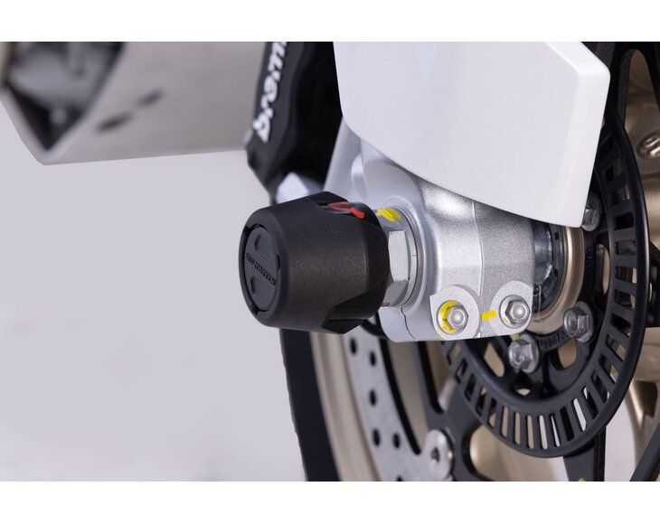 The front axle crash pads made of abrasion-resistant plastic protect the drive shaft from damage in the event of a fall. The smooth surface also provides excellent sliding properties. The polished bull logo in red adds a visual highlight to your motorcycle.