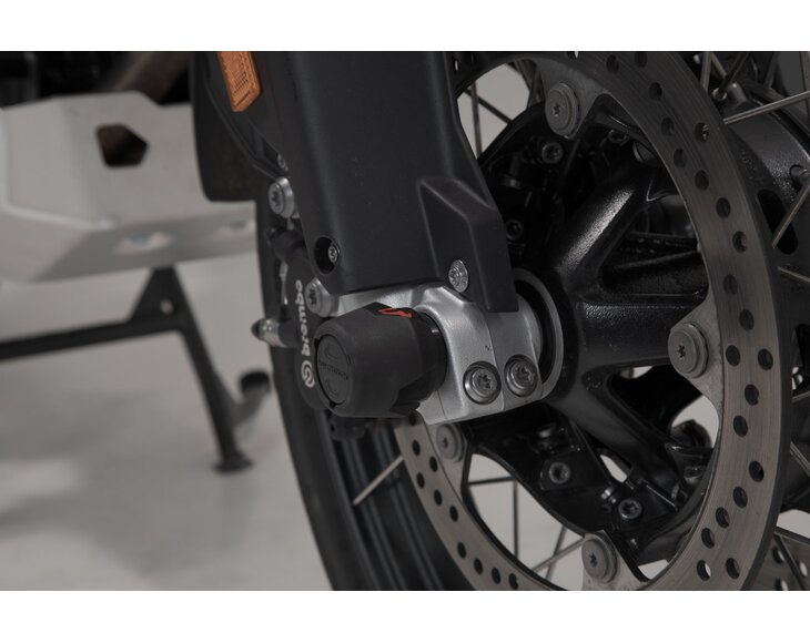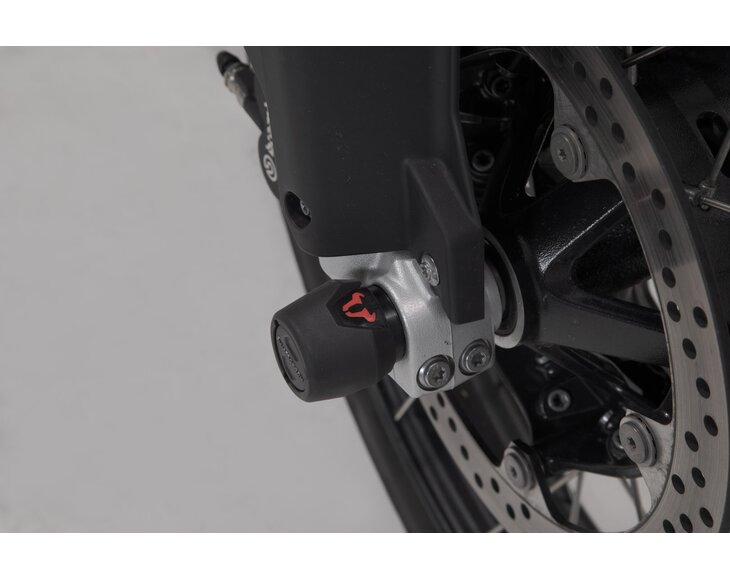 The front axle crash pads made of abrasion-resistant plastic protect the drive shaft from damage in the event of a fall. The smooth surface also provides excellent sliding properties. The polished bull logo in red adds a visual highlight to your motorcycle.