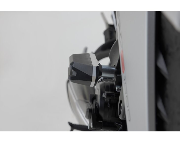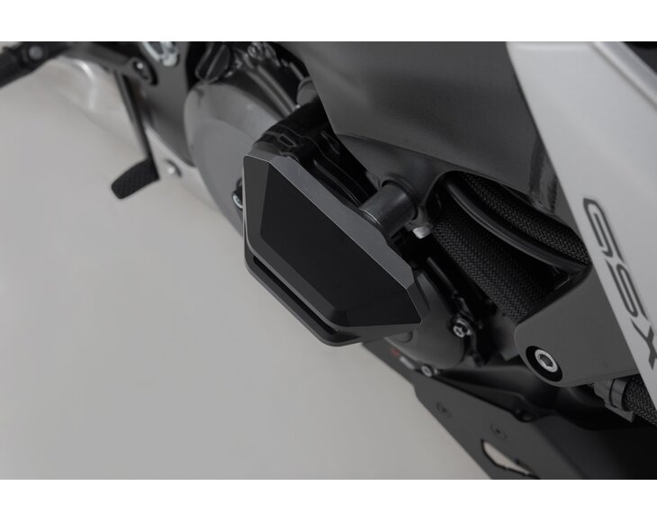 Frame crash pads provide additional protection in the event of a fall. The shape, surface and material of the pads provide excellent sliding properties to reduce damage to the motorcycle. The robust aluminium mounting bracket is easy to install, and the abrasion-resistant, CNC-milled slider pads are replaceable.