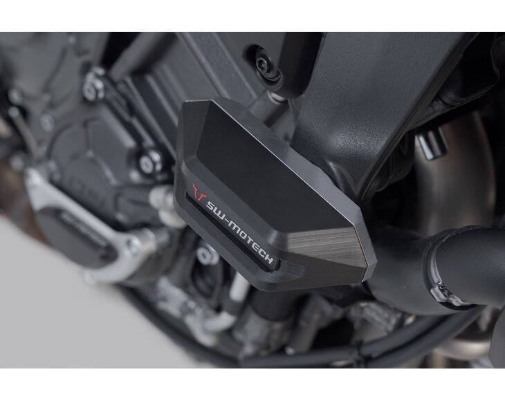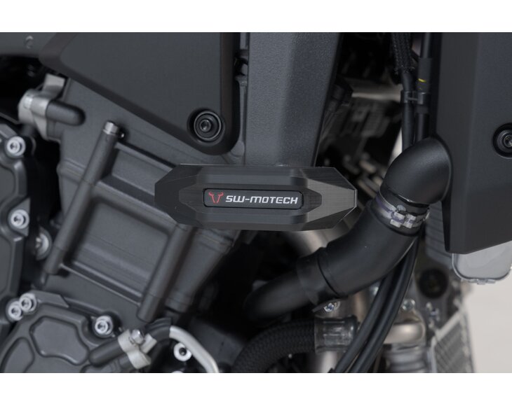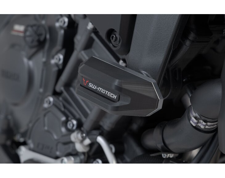 Frame crash pads provide additional protection in the event of a fall. The shape, surface and material of the pads provide excellent sliding properties to reduce damage to the motorcycle. The robust aluminium mounting bracket is easy to install, and the abrasion-resistant, CNC-milled slider pads are replaceable.