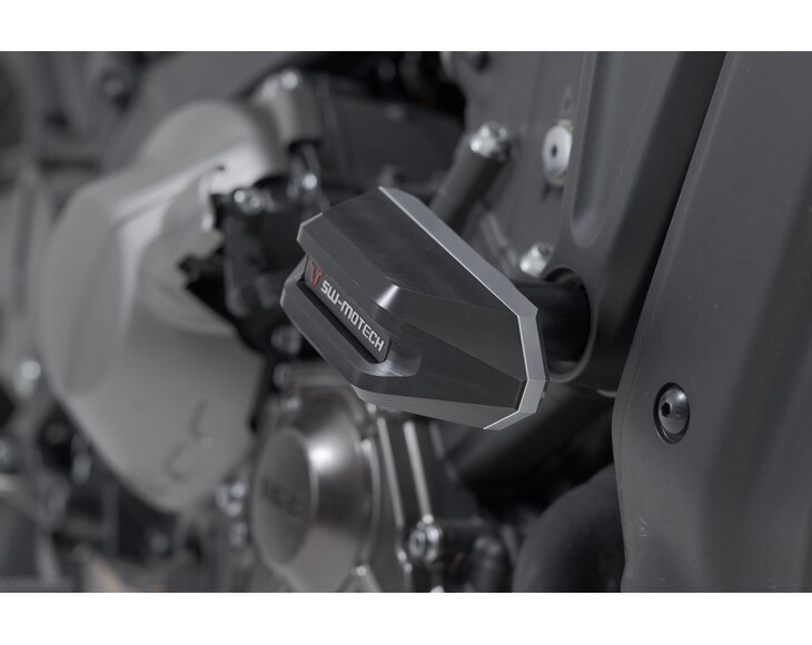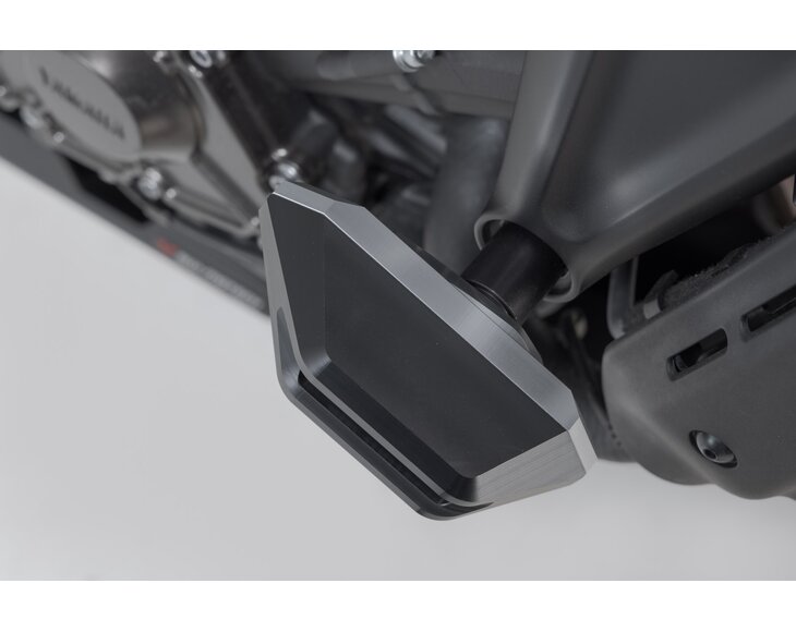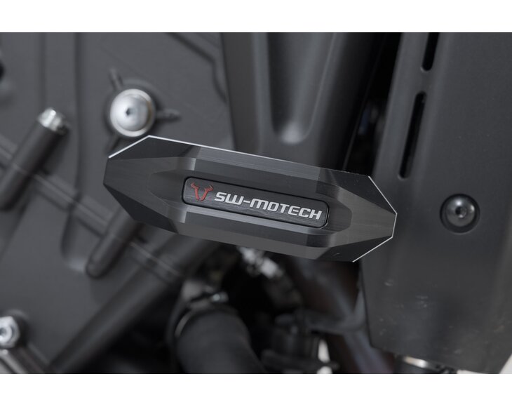 Frame crash pads provide additional protection in the event of a fall. The shape, surface and material of the pads provide excellent sliding properties to reduce damage to the motorcycle. The robust aluminium mounting bracket is easy to install, and the abrasion-resistant, CNC-milled slider pads are replaceable.