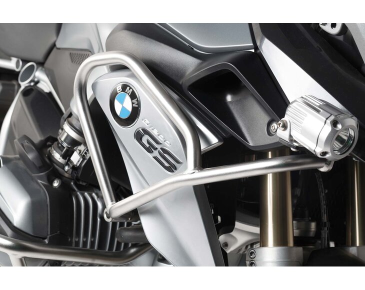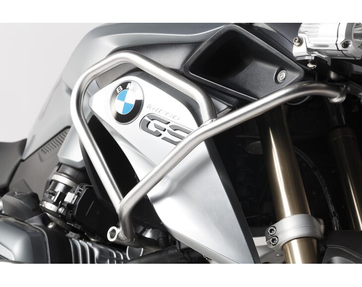 Upper crash bar, made of stainless steel, complementing the original crash guard for BMW R 1200 GS LC bikes built 2013 or later. In addition to supply sturdy and durable protection for the bikes tank and fairing, during the development process the protective frames design and finish have been tailored to exactly match the motorcycle manufacturers original crash guard. As a result the upper crash bar, mounted on existing anchor points on the bikes frame, perfectly fits the elegant long-distance motorcycles visual appearance.