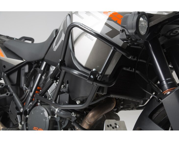 This rugged upper crash bar protects tank and fairing of the KTM 1290 Super Adventure R as well for 1290 Super Adventure S and 1090 Adventure from scratches and damage in case of an accident, helping to avoid costly repairs. The tough steel construction can easily be mounted to the motorcycles original crash bar. Impact resilient CNC machine milled fastenings, integrated into the steel tubing geometry, provide a safe fit. Rubber inserts reduce vehicle vibrations. The upper crash bar is available in black or orange color, matching the tone of the original crash bar. High grade powder coating provides protection against corrosion.