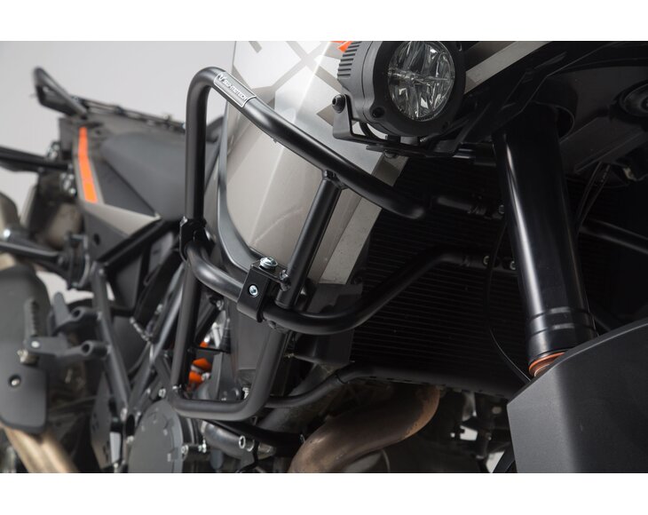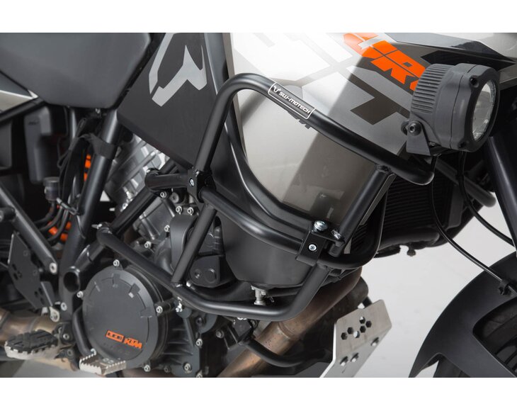 This rugged upper crash bar protects tank and fairing of the KTM 1290 Super Adventure R as well for 1290 Super Adventure S and 1090 Adventure (16-) from scratches and damage in case of an accident, helping to avoid costly repairs. The tough steel construction can easily be mounted to the motorcycles original crash bar. Impact resilient CNC machine milled fastenings, integrated into the steel tubing geometry, provide a safe fit. Rubber inserts reduce vehicle vibrations. The upper crash bar is available in black or orange color, matching the tone of the original crash bar. High grade powder coating provides protection against corrosion.