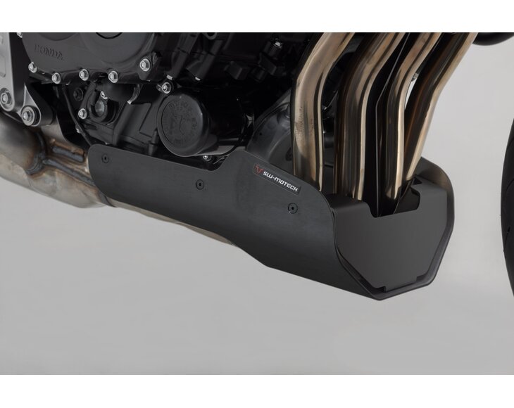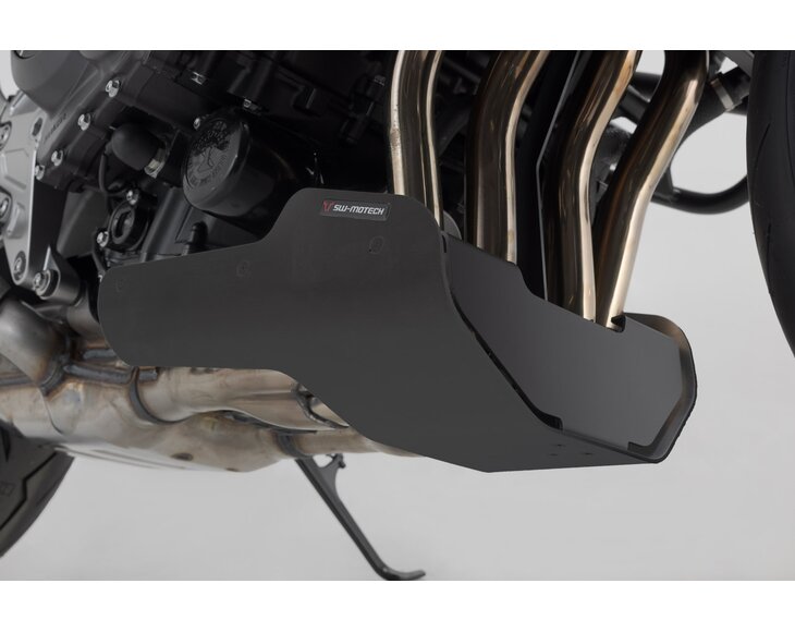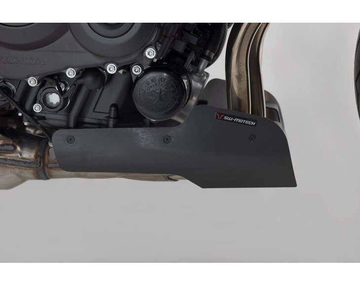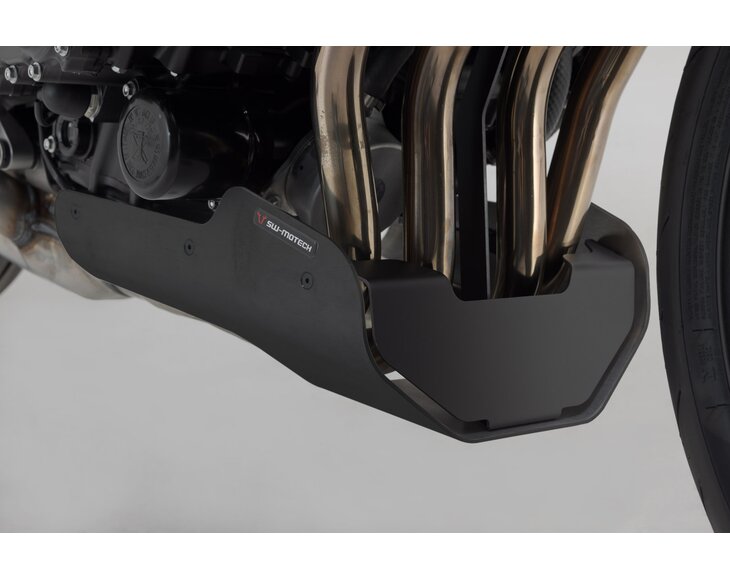 The SW-MOTECH front spoiler, which is tailored to the design of the bike, offers reliable protection against stone chips and unintentional contact with the ground. The powder coating on the surface is extremely durable and permanently protects against corrosion. Extremely sturdy underbody protection can be easily attached to original attachment points using the custom steel attachments provided, all without drilling or welding.