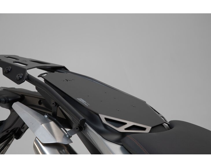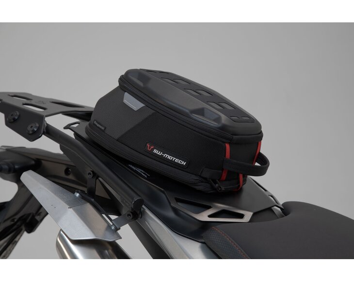PRO tank bags can also be quickly and securely attached to the rear using the PRO tank ring for the STEEL-RACK / SEAT-RACK. The PRO tank ring is attached to the mounting plate using four screws and makes it possible to snap on PRO tank bags with level bottoms.