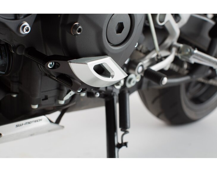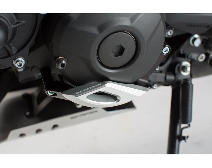 Protector for left engine case, machine milled from high-strength aluminum alloy. The elegant construction effectively prevents severe damage to the exposed parts of the engine case in case of ground contact or an accident. The protector consists of a black anodized aluminum frame and a silver anodized aluminum pad.