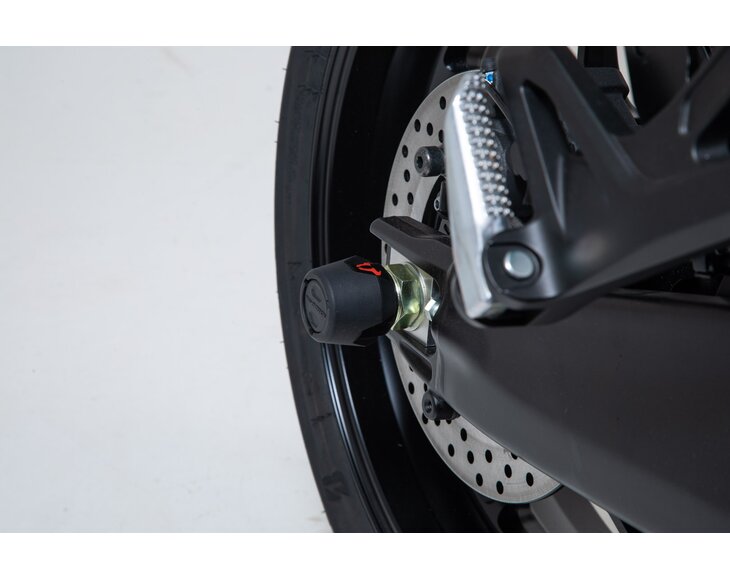 The rear axle crash pads made of abrasion-resistant plastic protect the swing arm from damage in the event of a fall. With a fiberglass content of 30%, the crash pad core is impact-resistant. The smooth surface also provides excellent sliding properties. The polished bull logo in red adds a visual highlight to your motorcycle.