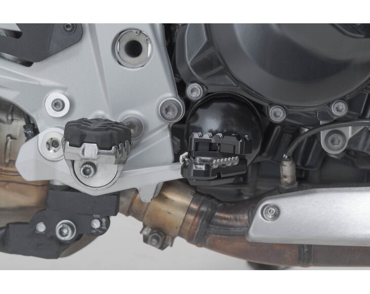SW-MOTECH manufactures these extensions from high-strength milled aluminum alloy; they feature a black anodized surface and a stainless steel step plate. For optimal ergonomic adjustment, the increase in the brake pedal step can be adjusted in two stages of 22 or 27 millimeters.
