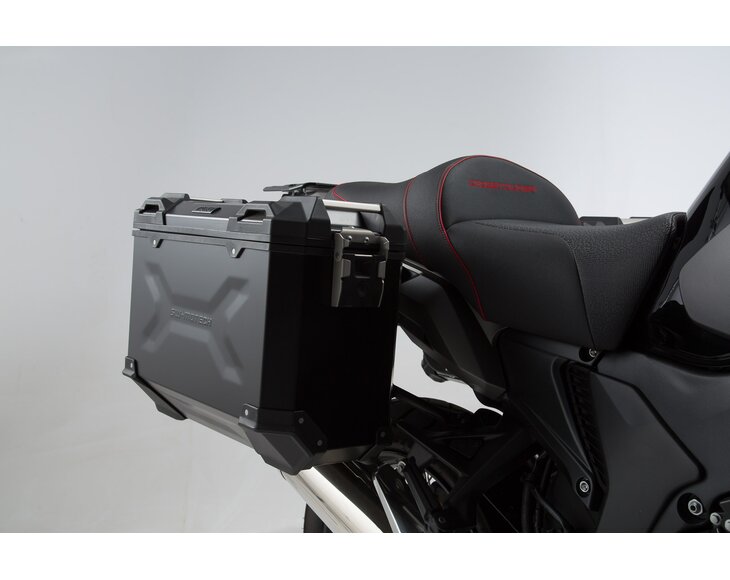 The tough TRAX ADV aluminum cases accept any challenge: Embossed designs add to the stability of the welded aluminum walls with a strength of 1.5 millimeters. The removable lid with anodized aluminum carrying handle and quick release fastener allows easy loading and unloading of the waterproof motorcycle cases. A lateral chamfer on the outer case edge provides ground clearance while cornering. With TRAX ADV aluminum pannier system you are ready for adventure. The complete system consists of the following components: TRAX ADV side cases, EVO carriers, adapters and lock cylinder set at an attractive price. Carrier and case configuration have been carefully selected to complement the motorcycle models tail geometry and exhaust system.