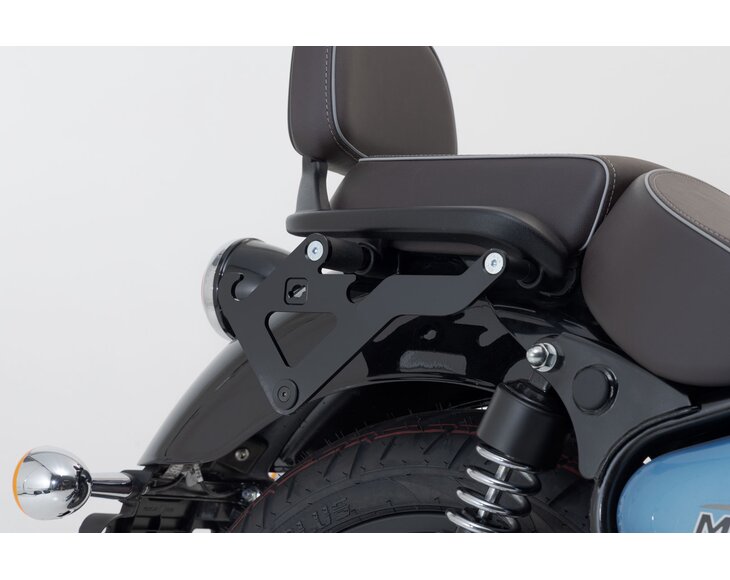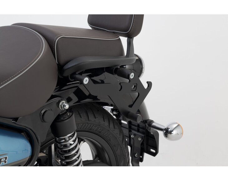 The bike-specific bag carrier can be easily and quickly mounted on to original attachment points on the fender strut. The quick lock system allows LH Legend Gear side bags to be attached and removed in just a few easy hand movements, without the driver foregoing reliable bag fastening.