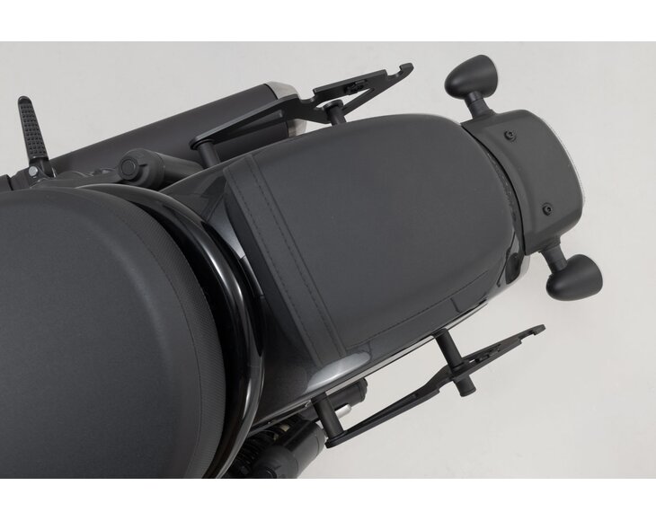 The bike-specific bag carrier can be easily and quickly mounted on to original attachment points on the fender strut. The quick lock system allows LH Legend Gear side bags to be attached and removed in just a few easy hand movements, without the driver foregoing reliable bag fastening.